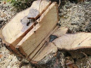 右からと、上からと、おろかなチェンソー使いの後が一目瞭然!チェンソーワークには多少の自負があったのだが‥ 不運ということにしておこう。