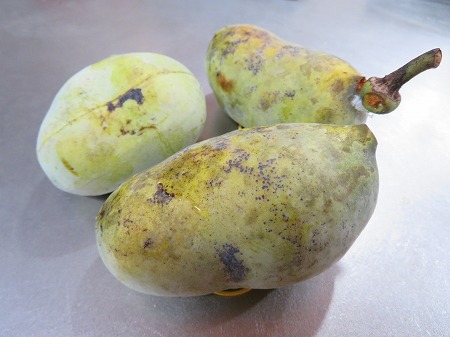 けさ、ポポーの実が熟して落ちたのを発見しました。右二つがきょう収穫したもの、左が二日前に収穫したものです。さっそく右上のを試食しました。生まれて初めて食べるポポーです。真ん中から長手方向に包丁を入れましたが種がじゃまをして切れません。仕方なく、反対側から包丁を入れましたが、割れません。手で二つに分けると実が崩れてしまいました。この種が始末が悪いようです。種もきれいに取れません。果肉としっかりくっついていて、手で種を除くと果肉はさらに崩れて見るに耐えません。流通経路に乗らないことがよく判りました。ただし、果肉は甘くておいしいです。完熟する前に収穫して歯ごたえがあったほうがよいように思いました。完熟するとぐずぐずなのです。おいしいですが、また食べたいとは思いません。めんどうです。クリの実は硬い殻を割って渋皮をむいて、何百個でもむいて嫌ではありませんが、ポポーは一個でも嫌です。不思議です。
