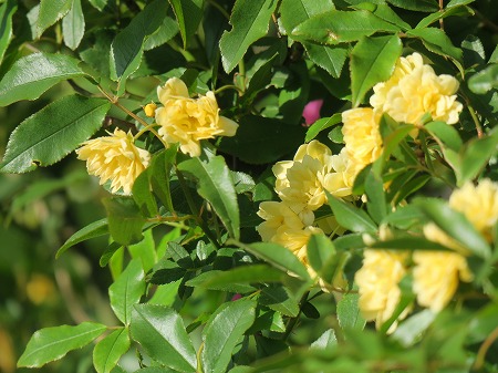 バラが咲き始めました。とはいってもちらほらです。一番はモッコウバラ、昨年冬小さく剪定したので花数が激減しました。