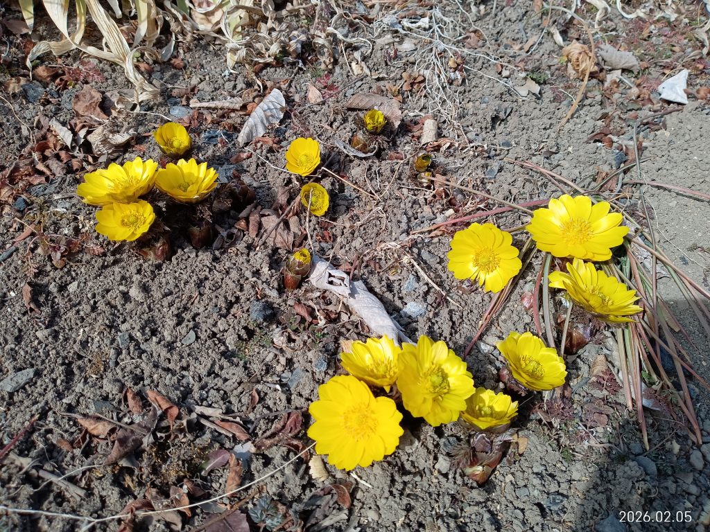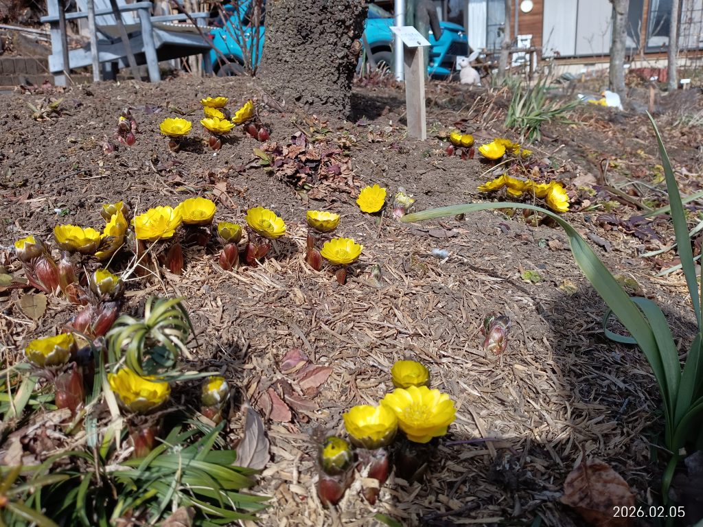 福寿草がもう一か月も前から咲いています。早いものはもう花も終わりかけていますし、まだつぼみの株もあります。ほとんど同じ株から成長したクローンなのにどうしておなじにさかないのでしょう。きっとそれぞれ環境が違うからでしょうね。