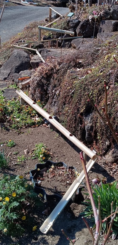 庭の中にビー玉でピタゴラスイッチを楽しむ遊具を作ってみました 。今回はまだ テスト 段階ですが 色々な装置を途中につけていこうと思っています。竹の節を抜くのが大変です 。特に割らずに 丸のまま使う時は、途中で節のところだけ穴を開けて節を抜くしかありませんでした。