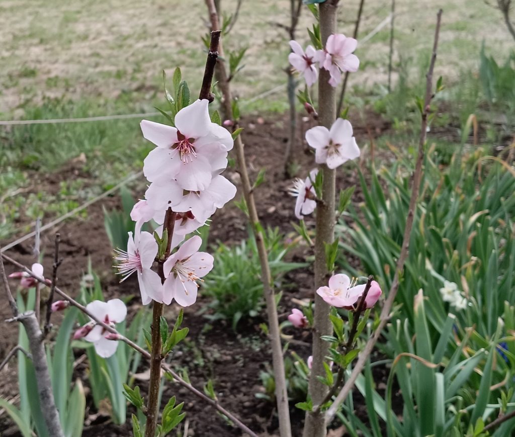 果樹の苗木を植えてから1年半。 初めての花が咲きました。 まだ ちらほらと咲いたということですが 、もしかしたら 実になるかもしれません。まずはアーモンドの花です。 アーモンドは桃の花 でも 受粉するようです。