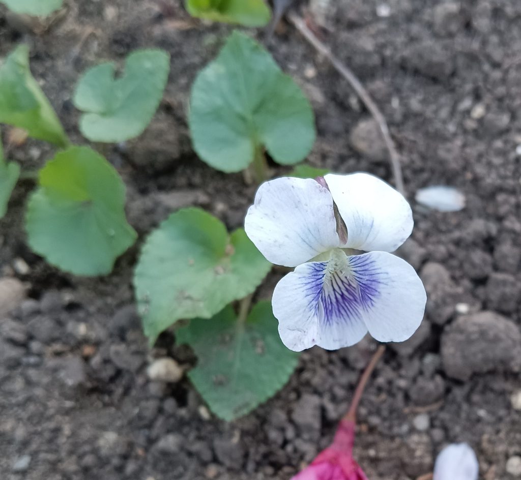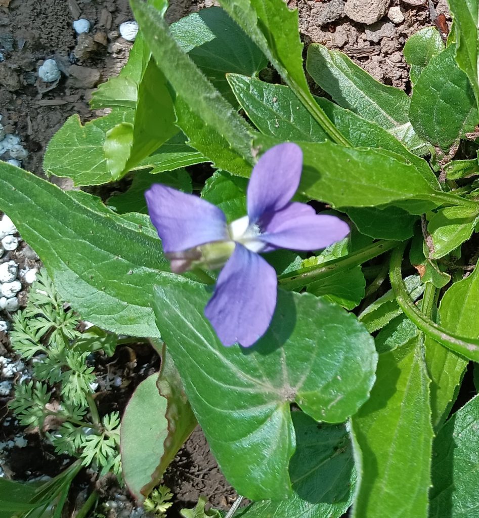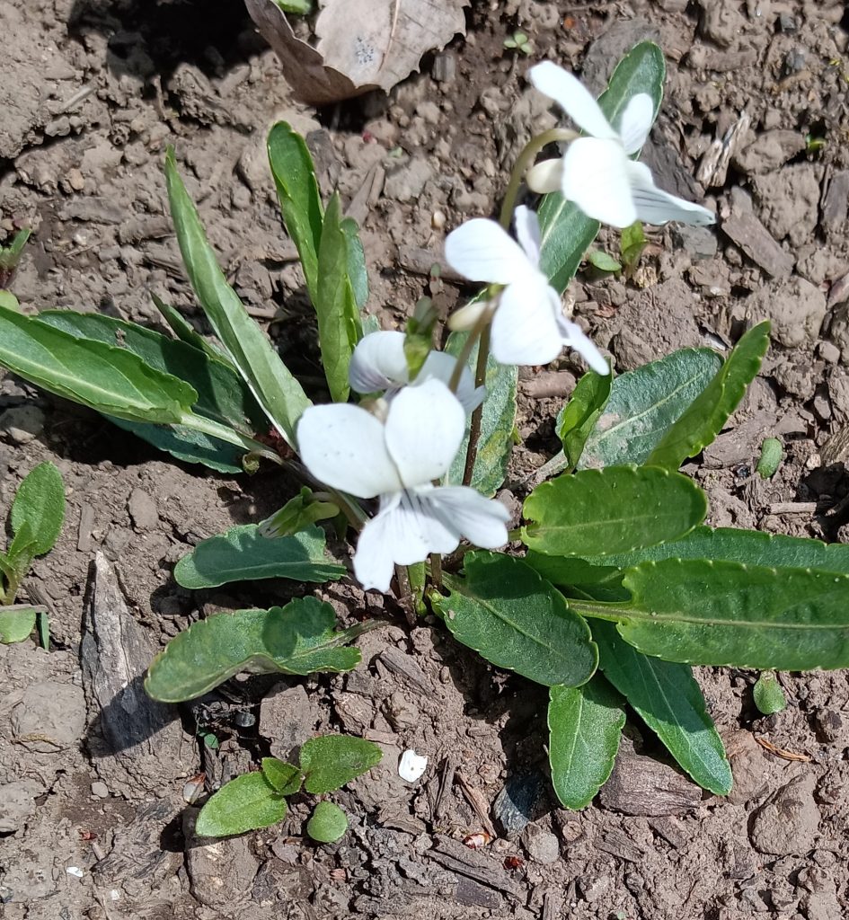 次の すみれは真っ白な すみれで、名前も シロスミレというようです。 細長い葉と葉柄に翼があるのが特徴のようです。